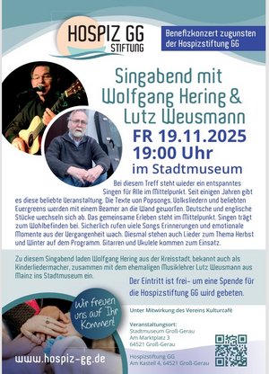 Zu diesem Singabend laden Wolfgang Hering aus der Kreisstadt, bekannt auch als Kinderliedermacher, zusammen mit dem ehemaligen Musiklehrer Lutz Weusmann aus Mainz ins Stadtmuseum ein.