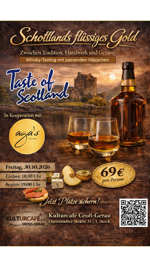 In Kooperation mit dem Whiskyladen “Taste of Scotland” werden ausgewählte Tropfen präsentiert, die die Vielfalt und Tiefe schottischer Brennkunst widerspiegeln – von rauchig und kraftvoll bis weich und fruchtig. Fachkundige Einblicke in Herstellung, Herkunft und Besonderheiten der einzelnen Whiskys machen den Abend zu einem Erlebnis für Einsteiger wie Kenner.